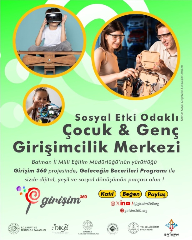 Batman İl Milli Eğitim bünyesinde kurulan GİRİŞİM360, çocuk ve gençlere geleceğin becerileri ve girişimcilik odağında yep yeni ve özel fırsatlar sunuyor.